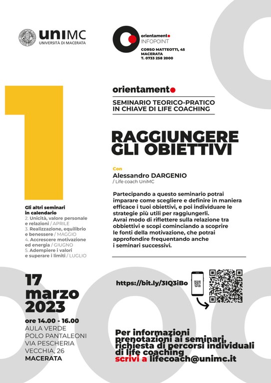 Per informazioni, prenotazioni ai seminari, richiesta di percorsi individuali di life coaching scrivi a lifecoach@unimc.it
